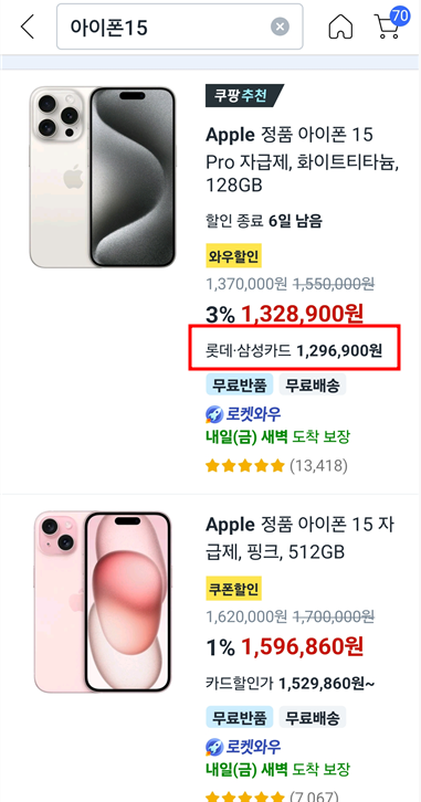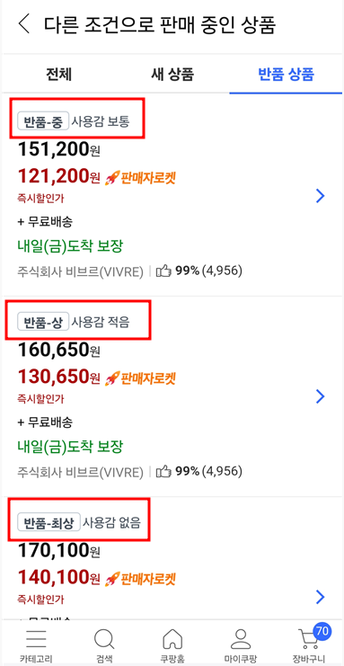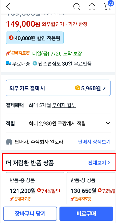 쿠팡에서 물건을 선택한 뒤에 아래로 스크롤해서 내리면 더 저렴한 반품 상품이 있습니다. 그런데 이것은 아무때나 뜨지 않습니다. 밤에 사람들의 접속이 뜸할 때 가끔 보이며 기다릴 수 있는 분들만 구입이 가능합니다. 간혹 스마트폰의 경우 25-30%까지 저렴한 제품도 나옵니다.