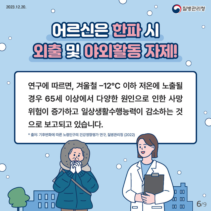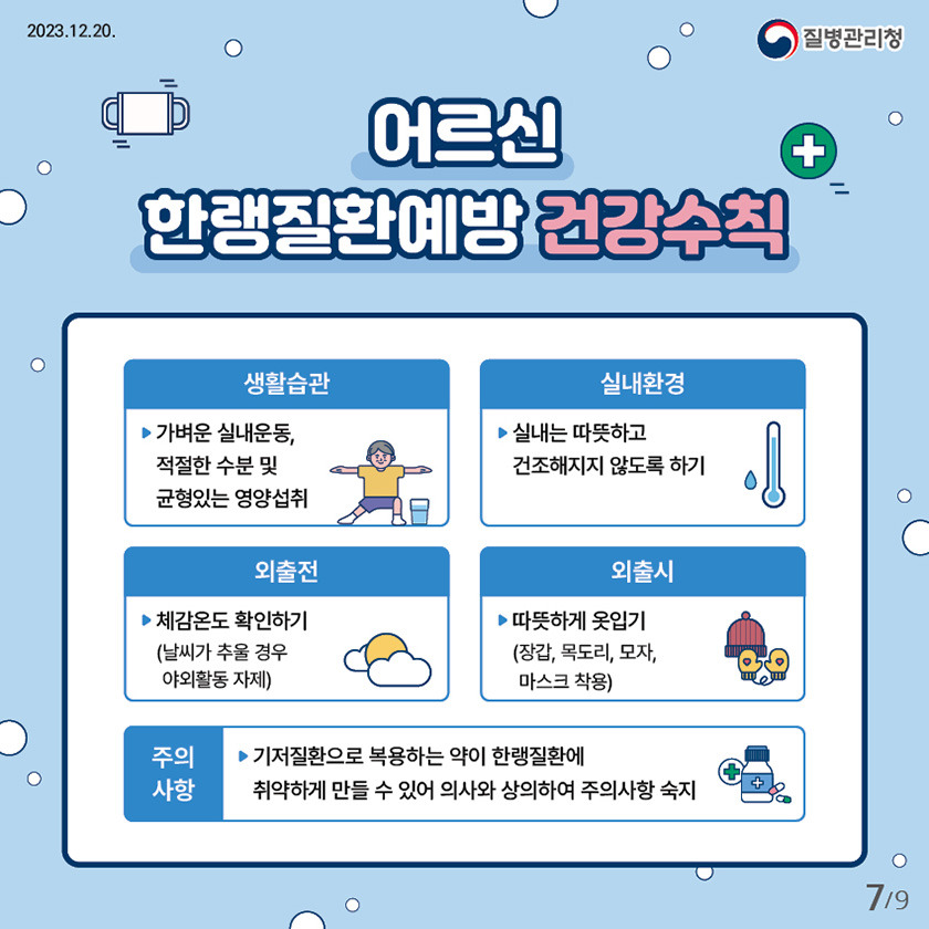 따뜻하게 옷을 입고, 규칙적인 식사와 수분 섭취로 체온을 유지하며, 무리한 야외 활동을 피하는 것만으로도 한랭질환을 예방할 수 있답니다. 또한, 주변에 추위로 어려움을 겪는 사람들이 있다면 도움을 주는 것도 중요한데요, 함께 건강하고 따뜻한 겨울을 보내기 위해 서로 신경 써주는 따뜻한 마음도 잊지 마세요.