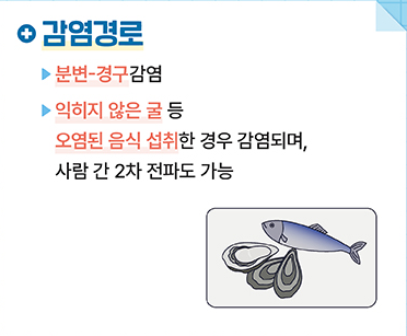 - 음식물: 오염된 음식물, 특히 굴과 같은 조개류가 대표적인 전파 원인이에요.