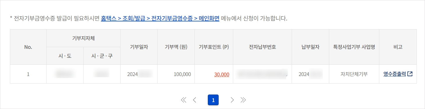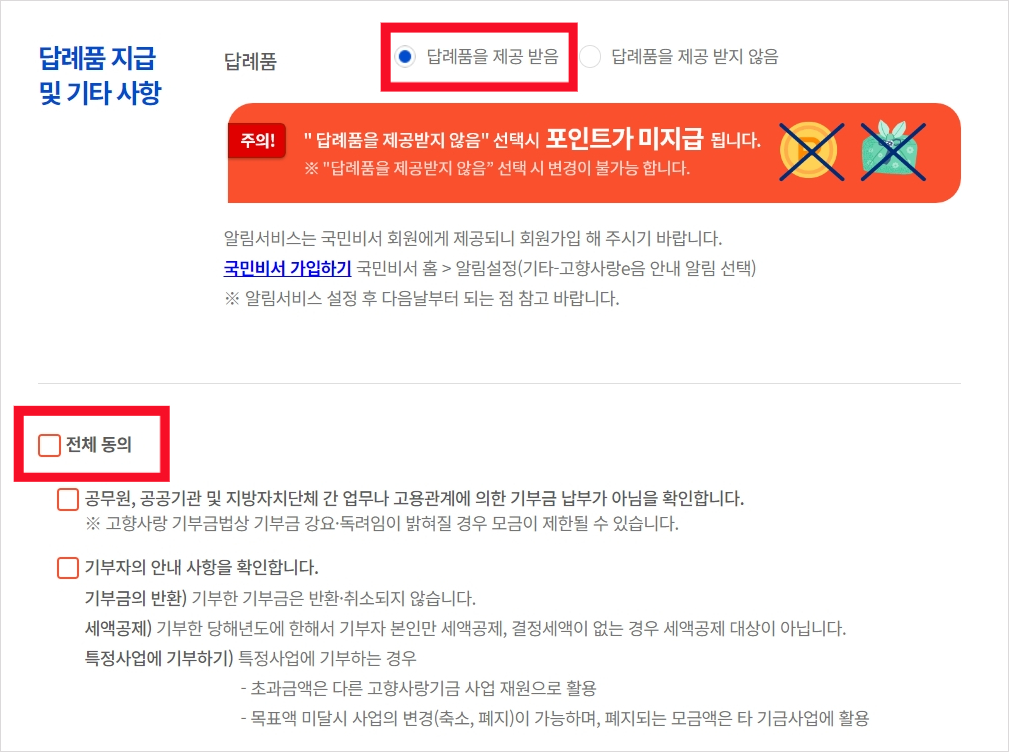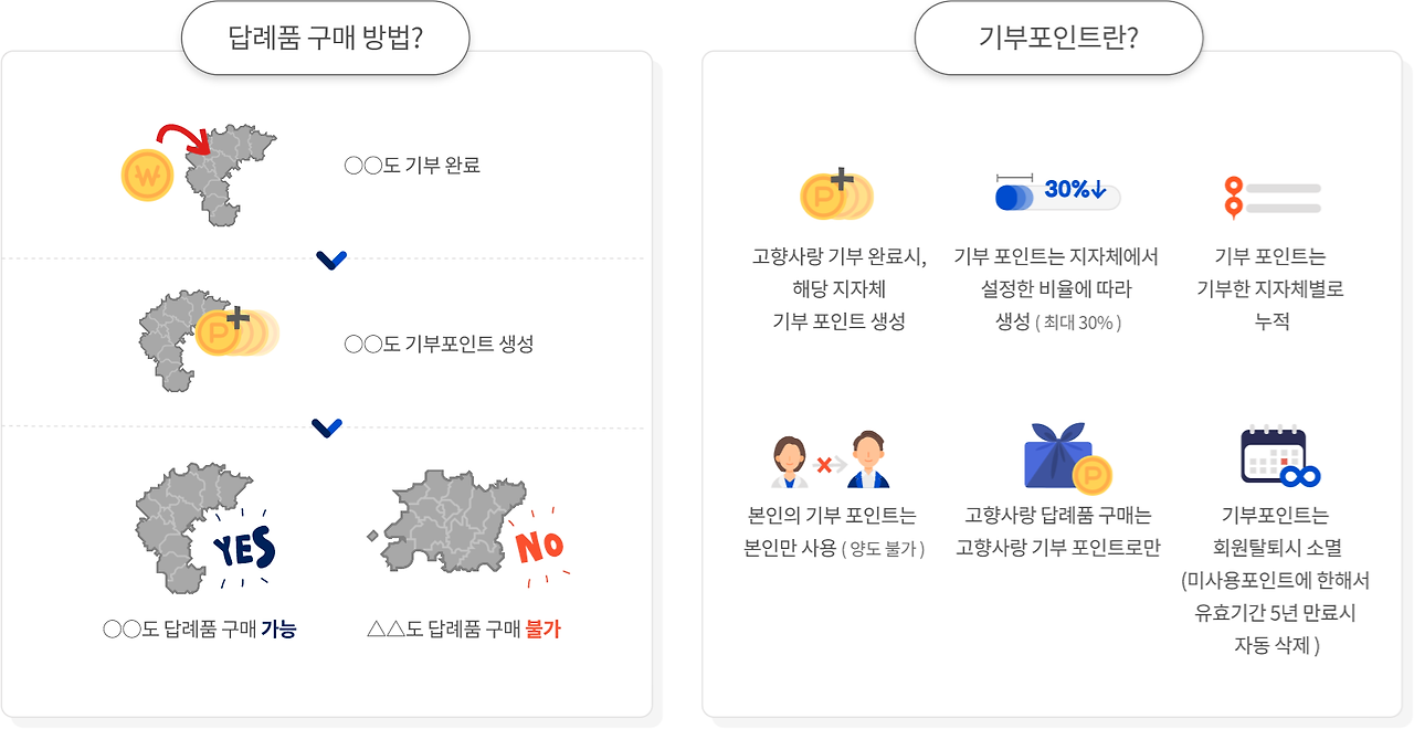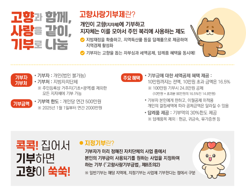 - 답례품: 기부금의 30% 상당의 지역 특산품을 답례품으로 받을 수 있습니다.