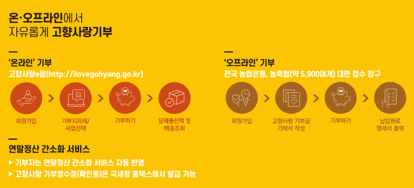 - 고향사랑e음: 온라인 플랫폼을 통해 간편하게 기부할 수 있습니다.