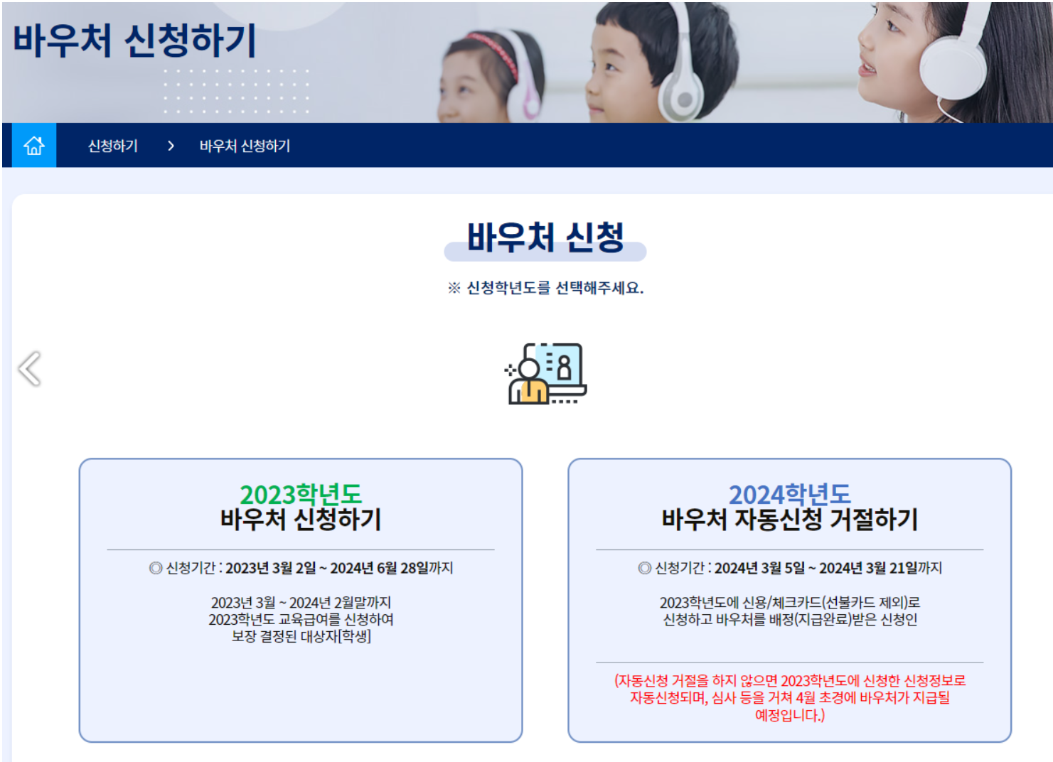 온라인으로는 교육급여 바우처 홈페이지를 통해 신청하거나, 오프라인으로는 행정복지센터를 방문하여 신청할 수 있습니다.
