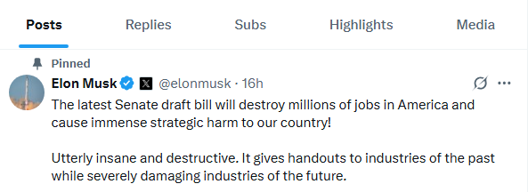 2025년 6월 28일, 자신의 생일에 머스크는 X(구 트위터)를 통해 상원 버전의 '크고 아름다운 법안'에 대해 강하게 비판했습니다. 그는 "완전한 광기!"라는 말까지 써가며 이 법안이 미국 경제와 미래 산업에 심각한 위협이 된다고 경고했습니다.