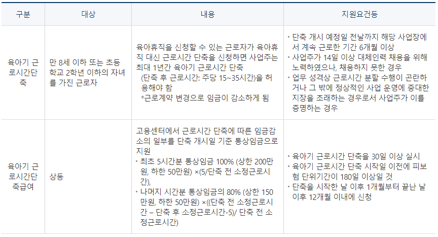 - 육아기근로시간단축급여 : 육아기에 근로시간을 단축하여 근무하는 경우 급여를 지원하여 출산ㆍ육아기 근로자의 경력단절을 방지하고 일과 가정의 양립을 지원