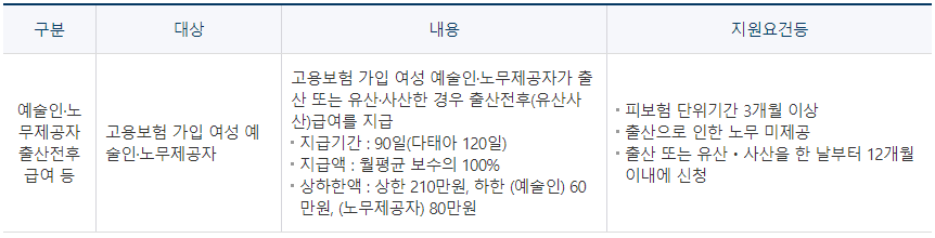 - 예술인ㆍ노무제공자 출산전후급여등 : 고용보험 가입 여성 예술인·노무제공자의 모성보호 및 고용안정에 기여