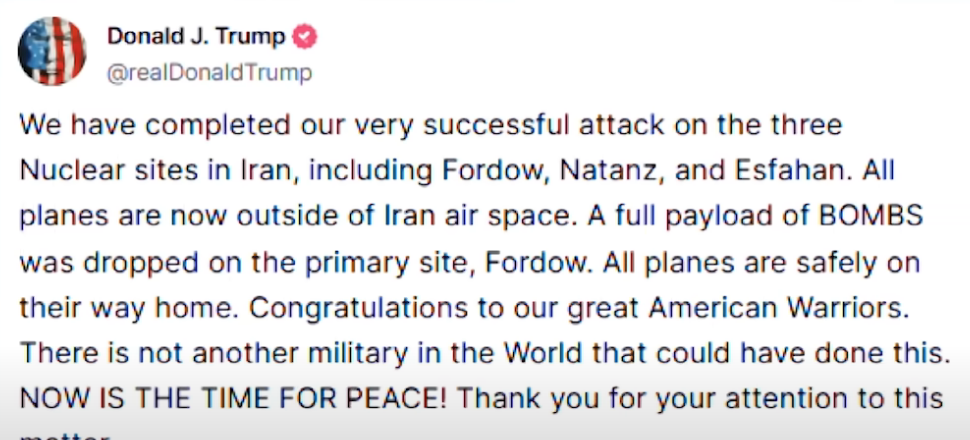 | "이란의 핵 농축 능력은 완전히, 전적으로 파괴되었다. 포르도는 끝장났다. 우리는 중동의 평화를 지키기 위해 행동했다." |