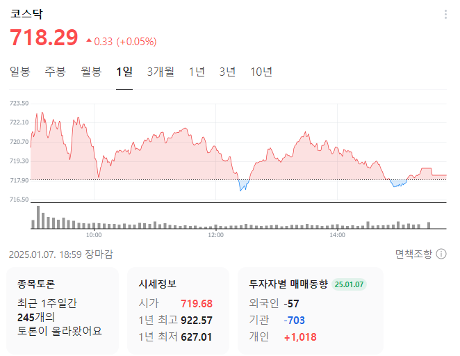 코스닥 지수도 전장보다 0.05% 오른 718.29포인트에 거래를 마감하며 닷새 연속 상승세를 이어갔습니다. 개인 투자자들은 1,025억 원 어치를 순매수했고, 외국인과 기관 투자자들은 각각 110억 원과 702억 원을 순매도하였습니다. 주요 종목 중에서는 JYP엔터테인먼트(JYP Ent.)가 7.89% 상승했으며, 알테오젠(3.33%), 레인보우로보틱스(3.86%), 리가켐바이오(4.87%) 등도 상승세를 탔습니다.