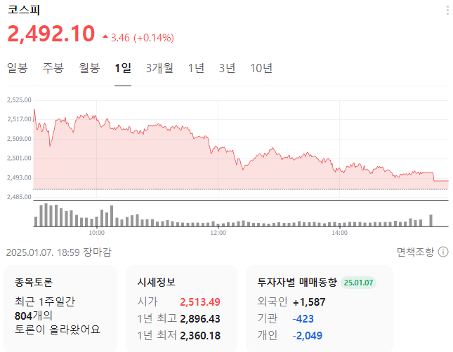한국거래소에 따르면, 코스피는 7일 사흘째 상승세를 이어가며 전장보다 0.14% 오른 2492.10포인트에 거래를 마감했습니다. 외국인 투자자들은 1,576억 원을 순매수했으나, 개인 투자자와 기관 투자자들은 각각 2,032억 원과 429억 원을 순매도하여 전체적으로는 외국인 순매수 효과가 있었습니다. 장중에는 한때 2521포인트까지 상승하는 모습을 보였으나, 오후 들어 개인과 기관의 차익 실현 매물이 나오면서 2500포인트 이하로 하락하게 되었습니다.