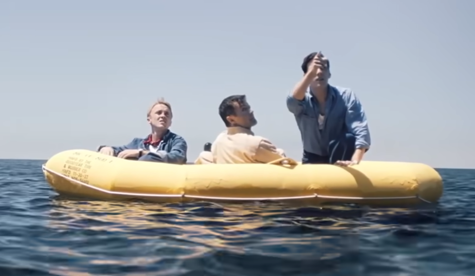 그들은 고무보트에서 구조 신호를 보내기 위해 손전등을 이용해 하늘을 비추었습니다. 아침이 되자, 멀리서 비행기 한 대가 지나가는 것을 보았습니다. 세 사람은 기쁨에 찬 목소리로 소리치고 손을 흔들었지만, 비행기는 그들을 발견하지 못한 채 그냥 지나쳤습니다. 그들은 다시 한번 절망에 빠졌지만, 해럴드는 포기하지 말자며 모두에게 용기를 북돋웠습니다.