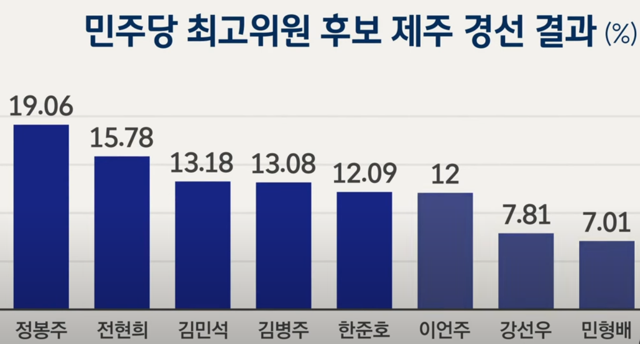 최고위원 선거에서는 유일한 원외 인사인 정봉주 후보가 약 19%의 득표율로 1위를 기록하며 권리당원 내 지지를 과시했습니다. 이어 전현희, 김민석, 김병주, 한준호 후보가 뒤를 이어 당선권에 이름을 올렸습니다. 이번 선거는 민주당 내 다양한 목소리를 반영하는 중요한 기회가 되었습니다.