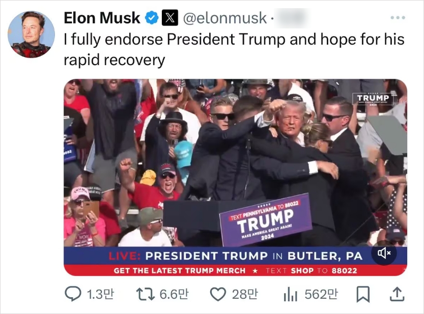 현지 시간으로 13일, 일론 머스크는 자신의 소셜미디어 계정에 “나는 트럼프 대통령을 전적으로 지지하며 그의 빠른 회복을 기원한다”는 글을 올렸습니다. 머스크는 이 글과 함께 트럼프 전 대통령이 경호원들에게 둘러싸여 주먹을 쥐고 흔드는 장면이 찍힌 동영상을 공유했습니다. 이 동영상은 트럼프 전 대통령이 총격 사건 후에도 지지자들에게 강한 모습을 보여주기 위해 노력하는 모습을 담고 있습니다.