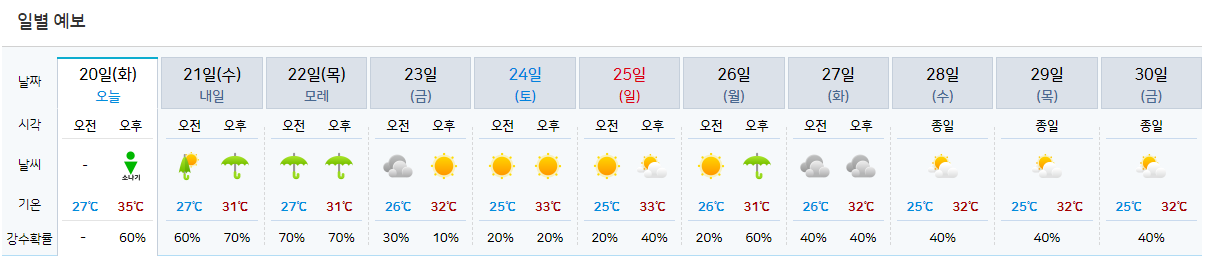 8월 21~22일 중부지방에 비가 내리면서 기온이 일시적으로 하강할 가능성이 있습니다. 하지만 기상청은 8월 23일부터 다시 기온이 올라가면서 폭염이 당분간 지속될 것으로 전망하고 있습니다. 이로 인해 국민들은 폭염과 열대야에 대한 대비를 철저히 해야 할 것입니다.