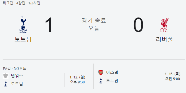 토트넘 리버풀 상대로 EFL컵 4강 1차전 승리, 손흥민은 72분 활약