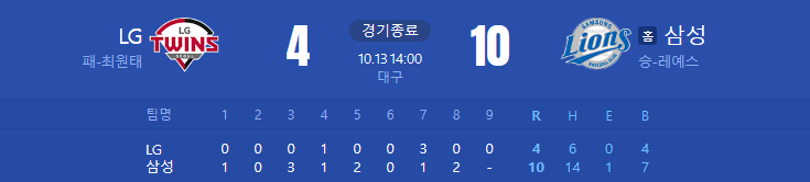 삼성은 5회에도 디아즈가 투런 홈런을 날리며 7-1까지 점수 차를 벌렸습니다. LG는 7회 초에 반격을 시도했습니다. 2아웃 만루 상황에서 1루수 디아즈의 실책으로 주자 두 명이 득점하며 7-4로 따라붙었습니다. 이어 신민재의 적시타가 터지면서 점수 차를 더 좁혔으나, LG의 반격은 거기까지였습니다. 삼성의 불펜 투수 김윤수는 152km의 강속구를 앞세워 LG의 공격을 차단했고, 8회 상대 투수의 폭투로 두 점을 추가하며 10-4로 경기를 마무리했습니다.
