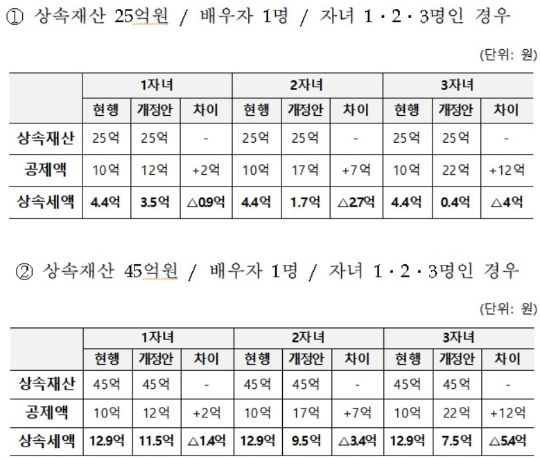또 다른 중요한 변화는 자녀공제의 대폭 확대입니다. 현재 자녀 1명당 5천만 원의 공제가 적용되지만, 이번 개편안에서는 5억 원으로 대폭 상향됩니다. 예를 들어, 자녀가 2명인 경우 공제액이 기존 1억 원에서 10억 원으로 늘어나게 됩니다.