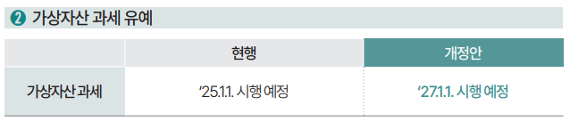 반면, 내년부터 시행될 예정이었던 가상자산 과세는 2027년까지 2년 유예됩니다. 이는 정부와 여당이 추진하는 '금융투자소득세'와의 과세 형평을 고려한 조치로 보입니다. 가상자산 소득에 대한 과세는 기본공제 250만 원을 제외한 금액에 대해 20%의 세율이 적용될 예정이었지만, 이번 유예로 인해 당분간 시행되지 않게 되었습니다.