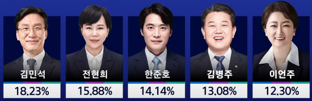 전현희(15.88%)·한준호(14.14%)·김병주(13.08%)·이언주(12.30%) 최고위원도 김민석 최고위원과 함께 새로운 지도부에 합류했습니다. 이들은 모두 친이재명계로, 수도권에 지역구를 둔 의원들입니다. 특히 전현희 최고위원은 경선 내내 당선권 안팎을 오르내렸으나, 김건희 여사의 명품 가방 수수 사건과 관련된 발언이 당원들의 표심을 움직인 것으로 분석됩니다.