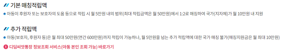 - 정부 매칭 지원: 아동 저축액에 대해 정부가 추가 지원