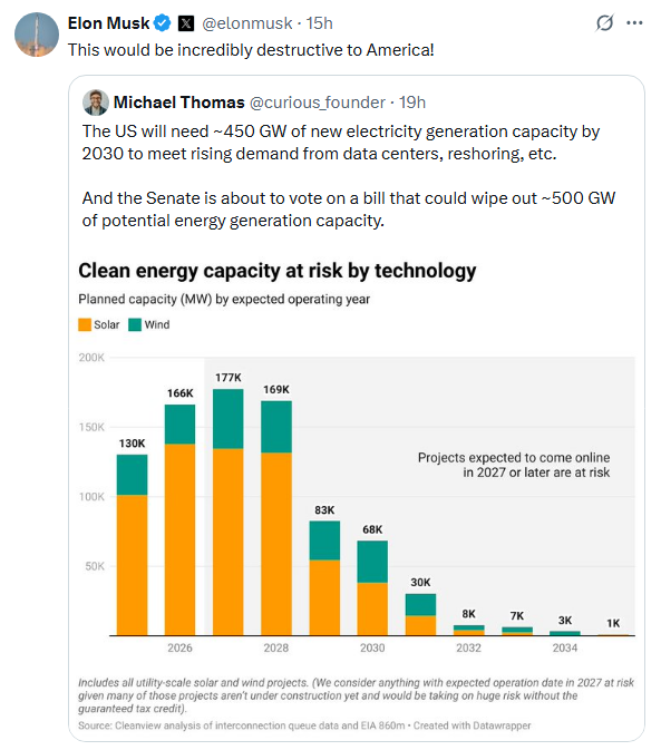 2025년 6월 28일, 자신의 생일에 머스크는 X(구 트위터)를 통해 상원 버전의 '크고 아름다운 법안'에 대해 강하게 비판했습니다. 그는 "완전한 광기!"라는 말까지 써가며 이 법안이 미국 경제와 미래 산업에 심각한 위협이 된다고 경고했습니다.