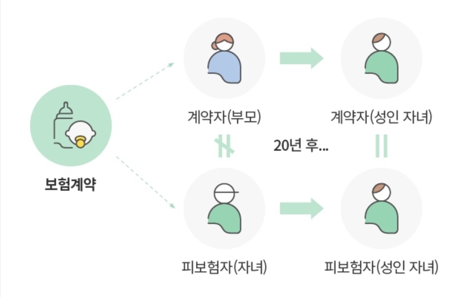 - 자녀보험의 경우: 가입시에는 부모가 계약자, 자녀가 피보험자가 됩니다. 자녀가 성인이 되어 스스로 경제 활동을 하게 되면 계약자를 자녀 본인으로 변경하는 경우가 많습니다.