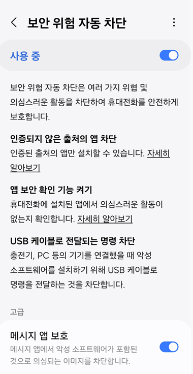 인증되지 않은 출처의 앱 차단, 앱 보안 확인 기능 켜기, USB 케이블로 전달되는 명령차단, 메시지앱 보호를 통해 악성 소프트웨어 차단으로 스마트폰에 대해서 잘 모르시는 분들은 큰 도움을 받을 수 있습니다.