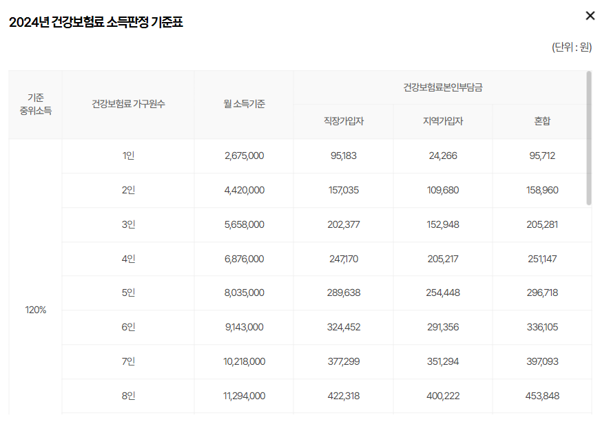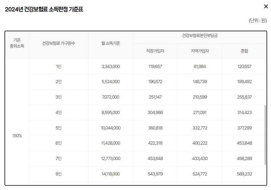 - 소득요건 : 2024년 2월 건강보험료 기준 2024년 소득기준표