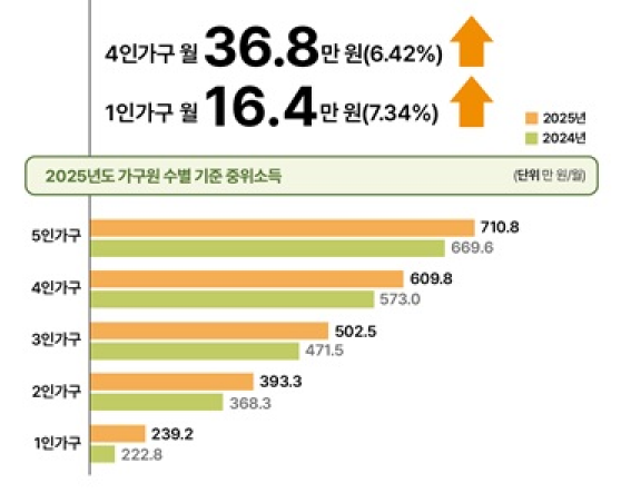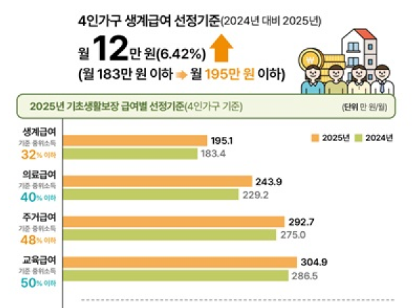 올해부터 생계급여 금액도 인상됩니다. 4인가구의 경우, 기존 월 183만 원에서 195만 원으로 약 6.42% 증가하며, 1인 가구는 월 71만 원에서 76만 원으로 약 7.34% 상승합니다. 이는 중위소득의 6.42% 인상과 함께 이루어진 결과로, 저소득층의 생활 안정에 큰 도움이 될 것입니다.