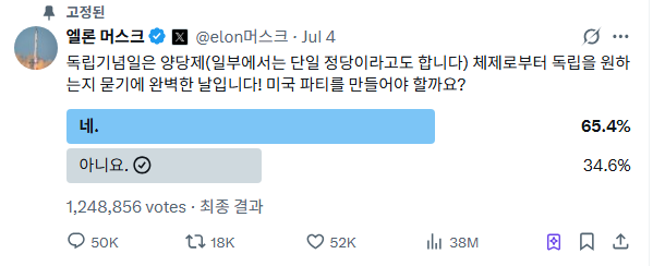 그는 자신의 소셜미디어 플랫폼 엑스(X)를 통해 새로운 정당 ‘아메리카당(America Party)’ 창당 찬반 투표를 올리며 공식 창당 의사를 밝힌 것입니다.
