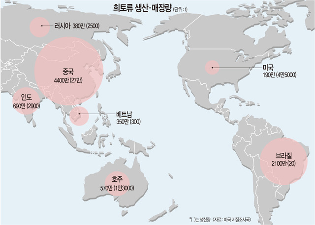 중국은 현재 희토류 매장량과 생산량 모두에서 세계 1위를 차지하고 있습니다. 미국 지질조사국(USGS)의 통계에 따르면, 2023년 기준으로 전 세계 희토류 자원의 총 매장량은 약 1억1000만 톤이며, 그중 중국의 매장량은 4400만 톤으로 전체의 약 40%를 차지하고 있습니다. 또한, 2023년 전 세계 희토류 생산량이 35만 톤인 가운데, 중국은 24만 톤을 생산하여 69%의 점유율을 기록하고 있습니다.