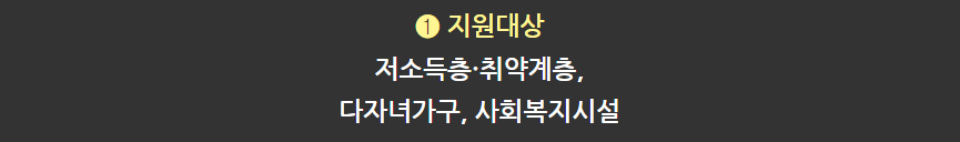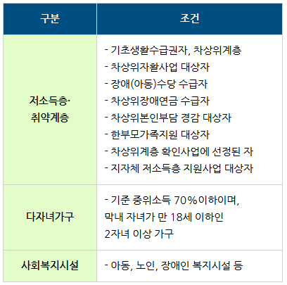 - 저소득층 및 취약계층: 기초생활수급권자, 차상위계층, 장애수당 수급자 등