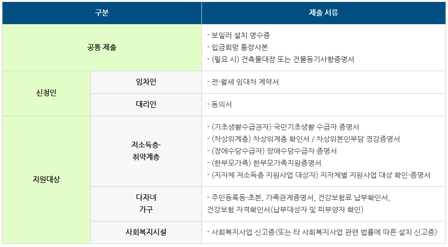 - 공통 서류: 보일러 설치 영수증, 입금희망 통장사본, 필요시 건축물대장 또는 건물등기사항증명서