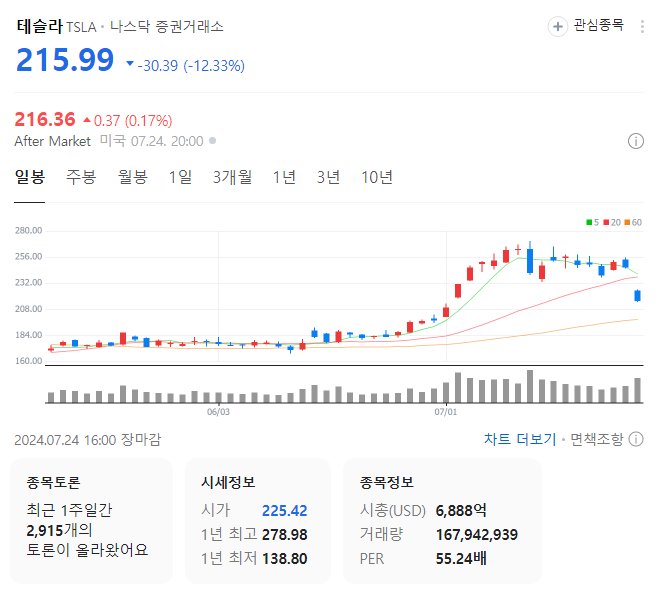 미국 전기차업체 테슬라가 2분기 시장의 기대에 못 미치는 실적을 발표하면서 주가가 크게 하락했습니다. 일론 머스크 최고경영자(CEO)의 발표 내용도 실망스럽다는 평가가 나오며, 24일(현지시간) 테슬라 주가는 장중 10% 넘게 하락했습니다. 뉴욕증시에서 낮 12시 20분 기준(미 동부시간) 테슬라 주가는 전장보다 10.08% 내린 221.55달러에 거래되었습니다. 한때는 214.71달러까지 내려 12.85% 하락하기도 했습니다.