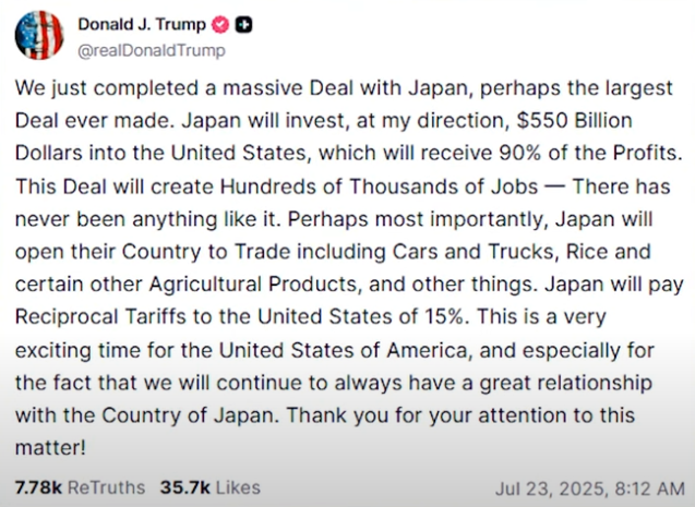 이번 협정은 사실상 트럼프 대통령의 강한 압박 아래 이뤄진 결과입니다. 트럼프는 일본에 보낸 서한에서 “8월 1일까지 협정이 체결되지 않으면 일본산 제품에 25% 관세를 부과하겠다”고 경고한 바 있습니다.