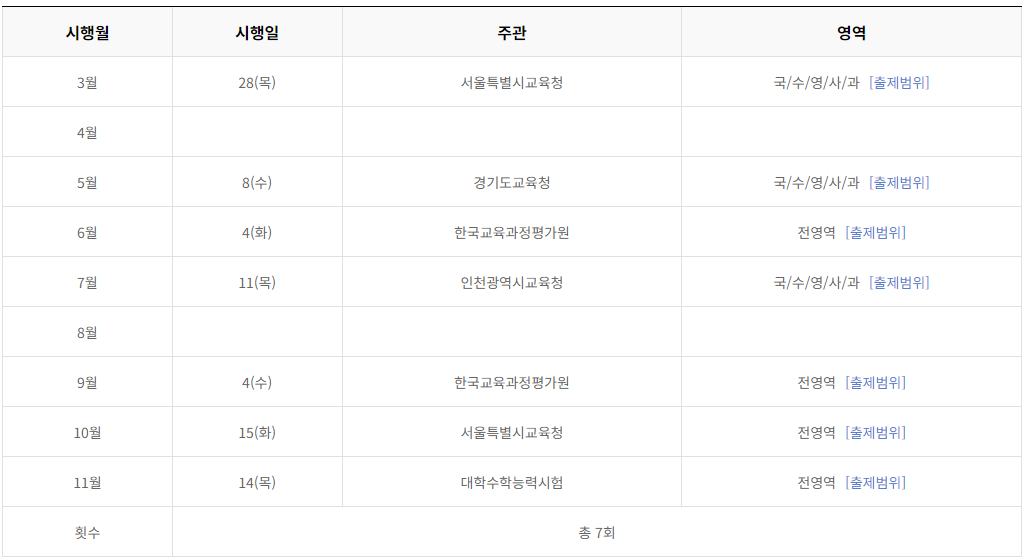올해는 전국연합학력평가(모의고사)를 고1, 2학년은 4회, 고3은 6회가 예정되어 있습니다. 대학수학능력평가는 11월 14일에 실시하며 올해와 마찬가지로 킬러문항은 없지만 난이도가 있을 것으로 예상됩니다. 또한 EBS연계 문항이 많아질 것으로 생각됩니다. 내년도 의대 정원이 대폭 증가함에 따라서 모의고사에 재수생의 참여가 많이 늘어나는 점도 잘 판단해야 할 것 같습니다.