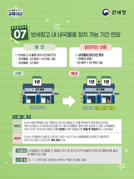 - 내국물품도 외국물품과 동일하게 1년 범위에 1년 연장 가능하도록 적용하여, 실질적인 장치 기간이 확대됩니다.