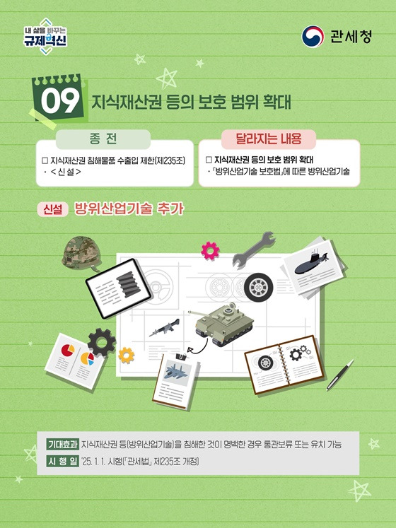 - 지식재산권 및 방위산업기술 침해가 명백한 경우, 통관보류 또는 유치가 가능해져 국내 산업 보호에 기여할 것입니다.