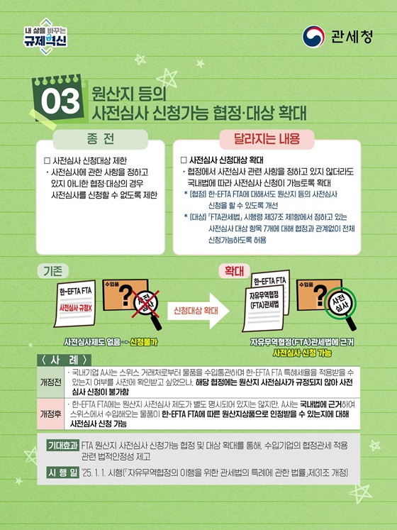 - FTA 원산지 사전심사 신청 가능한 협정 및 대상이 확대되어 수입기업의 협정관세 적용과 법적 안정성이 제고됩니다.