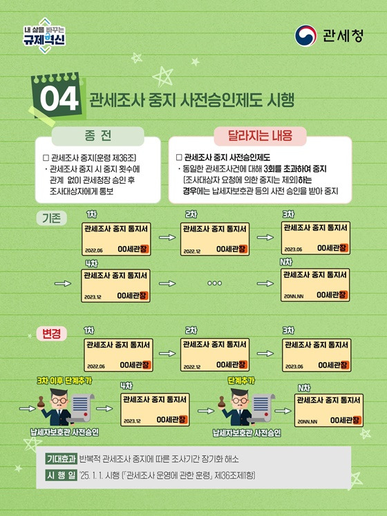 - 동일한 관세조사 건에 대해 3회 초과하여 중지할 경우, 납세자보호관 등의 사전 승인을 받아야 하도록 변경됩니다.