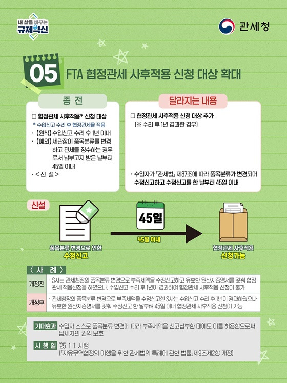 - 수입자가 「관세법」 제87조에 따라 품목분류 변경으로 수정신고한 경우, 수정신고일로부터 45일 이내에도 사후적용 신청이 가능하도록 대상이 추가됩니다.