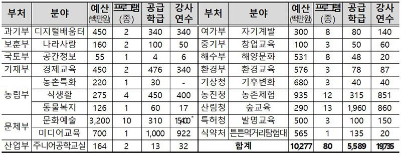 정부는 2025년에 범부처 협업 사업에 총 108억 원을 편성해, 16개 부처와 청이 협력하여 19개 분야에서 총 80종의 프로그램을 개발하여 5589학급에 제공할 계획입니다. 또한 지자체와 대학에도 212억 원을 투입해 지역의 수요에 맞는 150종 이상의 프로그램을 개발하고 6000개 이상의 학급에 프로그램을 제공할 예정이에요.